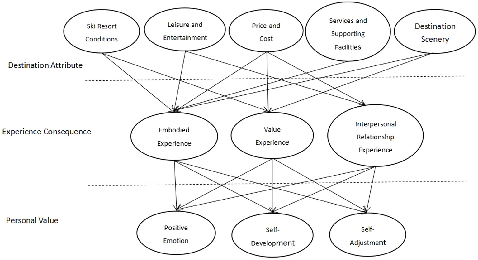 Through the interviews, this study obtained several relevant elements of destination attributes, experience consequences, and personal value considered by ski tourism enthusiasts in destination selection. We encoded the elements in the interview text. The data are classified and summarized according to the model framework (attribute, consequence, and value) of the means-end chain theory. Finally, a total of 47 measurement elements were coded and summarized into three levels: destination attribute, experience consequence, and personal value. Among them, the destination attribute level includes 20 elements, such as snow quality and condition, the length, width, and slope of the ski tracks. The experience consequence level includes 15 elements, such as improving skills, saving time, high comfort level, and high-cost performance. The personal value level includes 12 elements, such as a sense of satisfaction, a sense of achievement, a sense of security, and a sense of belonging (see Table 1). According to the means-end chain theory, it is expected that factors at the destination attribute level would significantly affect factors at the experience consequence level, which, in turn, would impact factors at the personal value level.