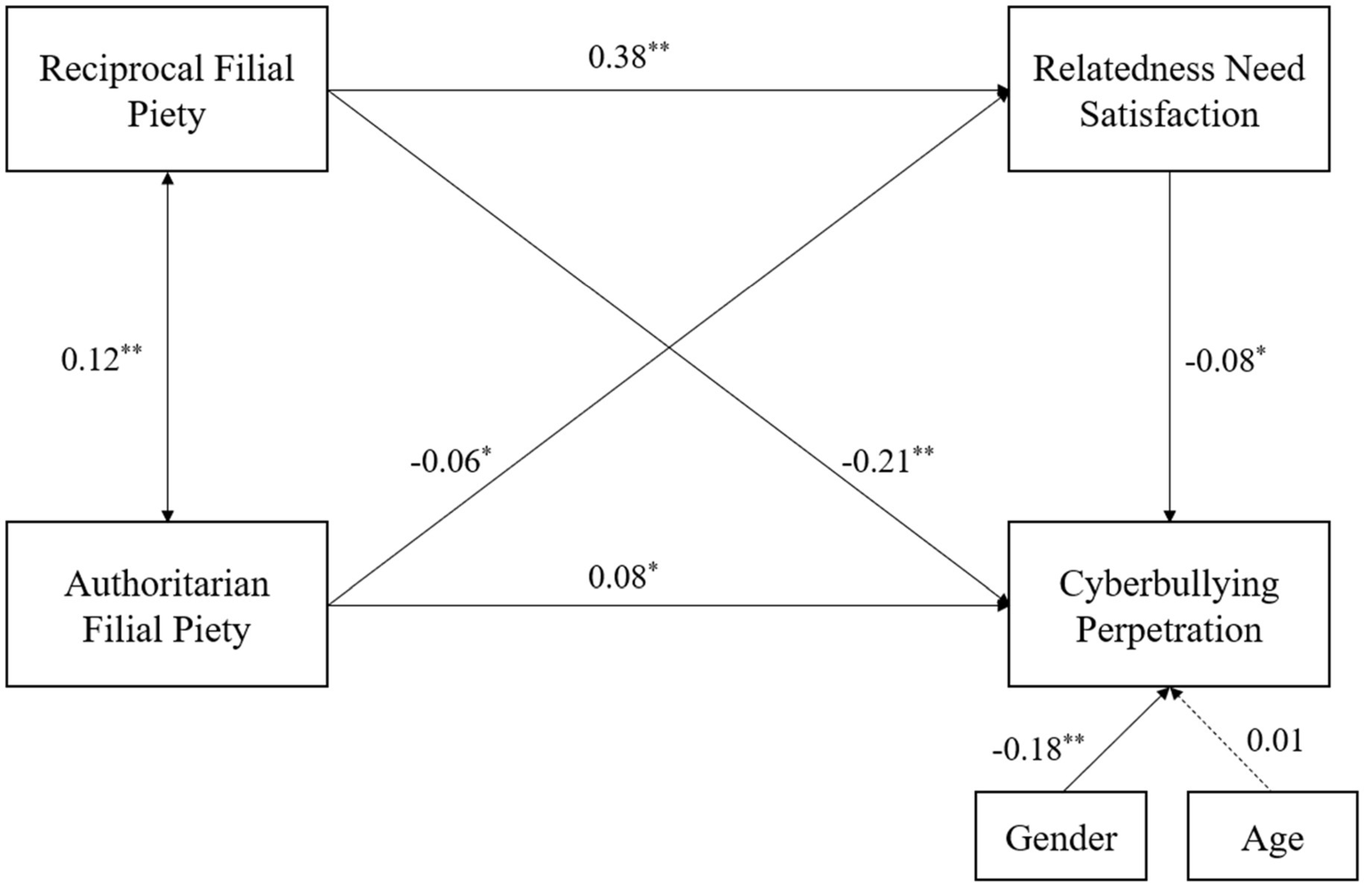 Thereby, we propose H2: Filial piety belief influences cyberbullying perpetration through the mediating role of relatedness need satisfaction. RFP positively affects relatedness need satisfaction, whereas AFP negatively affects relatedness need satisfaction. Relatedness need satisfaction has a negative impact on cyberbullying perpetration.