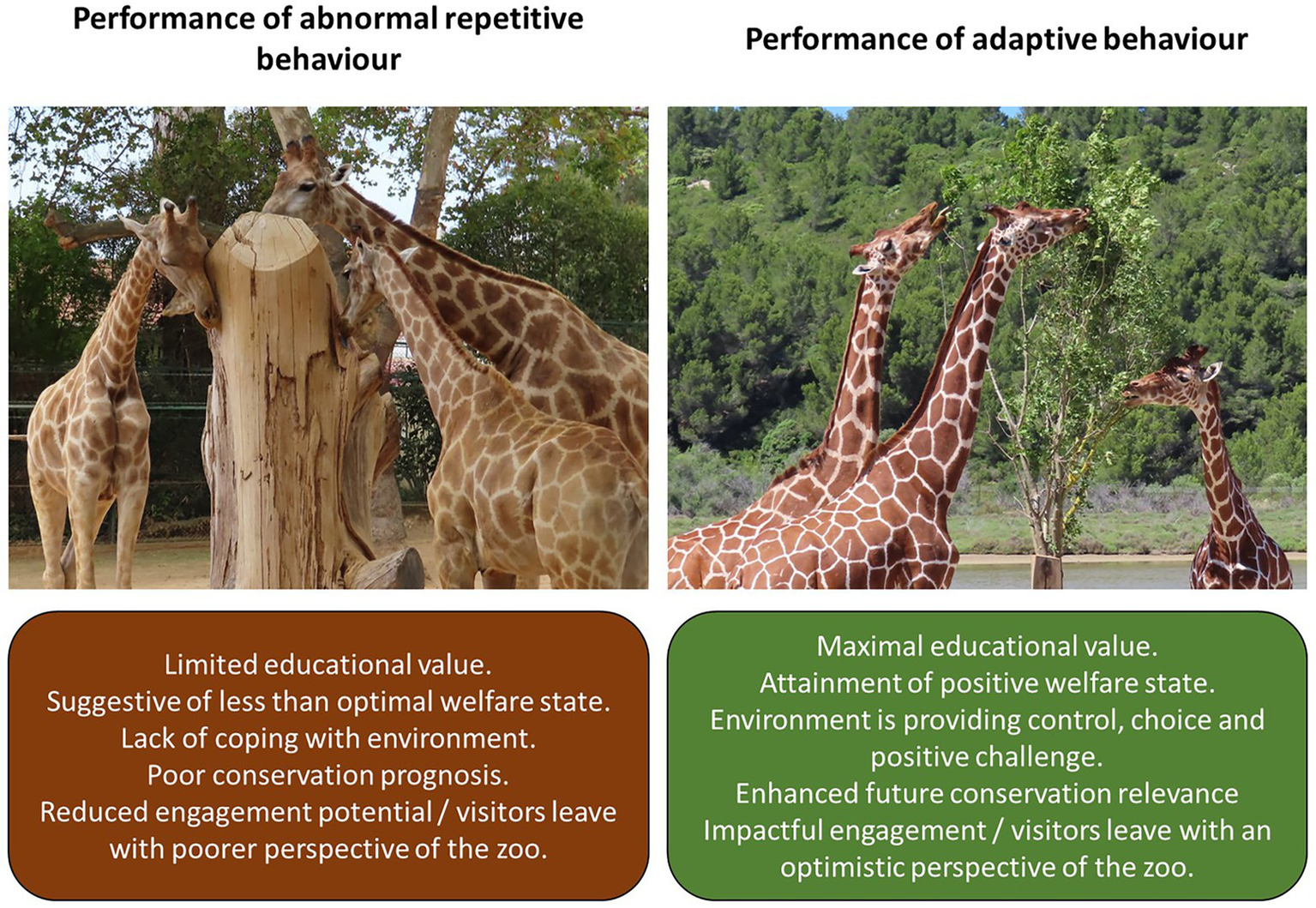Figure 2 illustrates the same species but with two very different connotations of animal welfare state. Giraffes (Giraffa camelopardalis) are prone to the development of abnormal repetitive behaviors (e.g., stereotypic oral actions such as licking, vacuum chewing and wind sucking) in the zoo (Bashaw et al., 2001; Baxter and Plowman, 2001). Such behaviors can negatively impact on animal health and are suggestive of poorer welfare and a lack of suitable husbandry and diet (Baxter and Plowman, 2001; Kulkarni, 2020). When provided with opportunities to browse on tree branches, giraffes reduce abnormal behavior performance (Bashaw et al., 2001) and therefore illustrate their evolutionary adaptations for foraging to zoo visitors. Changes to husbandry that improve behavioral outputs and therefore welfare, can improve the visitor’s perspectives of the zoo and how the visitor feels towards the animals that are being observed (Coe, 1985). The visitor becomes more engaged with the species and the “story” that the species tells about its habitat, place in the world and how it is impacted by human activities if the animal presents as a replica of what it can do in the wild state.