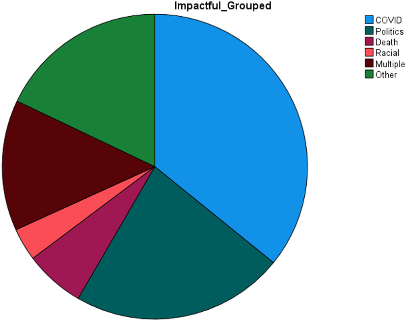 Of the 201 participants, 28 did not indicate their most stressful event of the past year and were not included in the following percentages. Of the 173 remaining, 35.8% (n = 62) reported COVID-19 as the most stressful event of the past year, 22.5% (n = 39) rated politics as the most stressful event of the past year, 13.9% (n = 24) rated multiple events (i.e., COVID and politics) as the most stressful, and 17.9% (n = 31) rated “other events” as the most stressful. Please see Figure 1 for complete comparisons of the most impactful events.