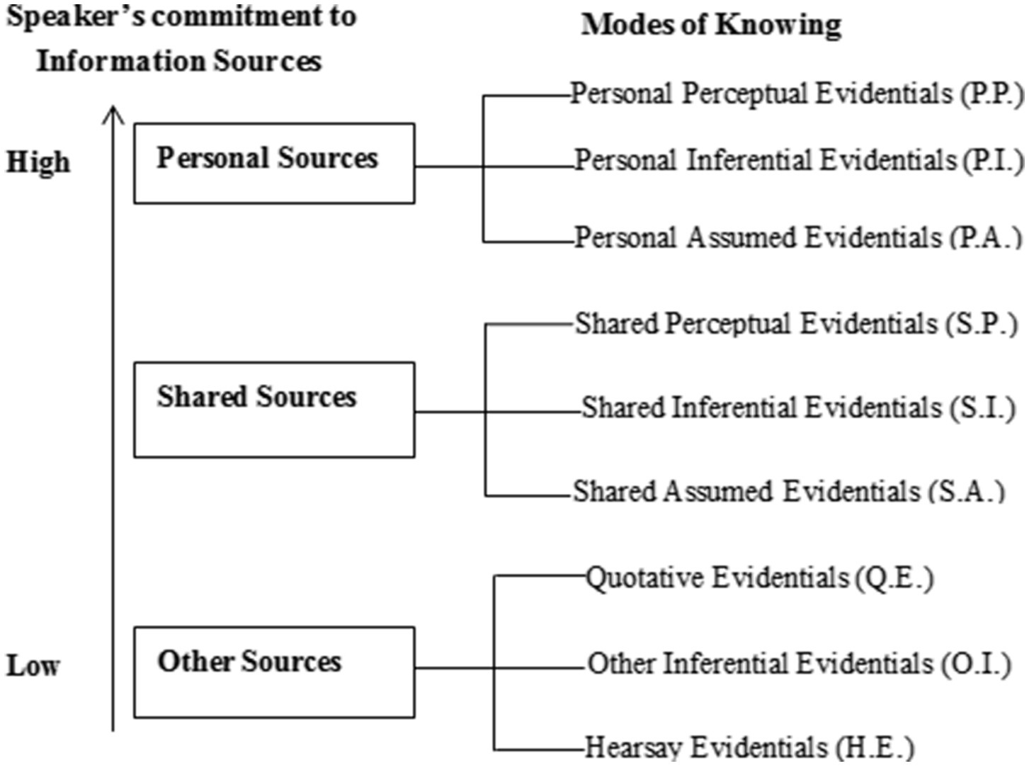 As mentioned in the introduction, the previous studies often use “source of knowledge” or “mode of knowing” (or “forms of access to the information”) in the classification of evidentiality. These two notions may cause confusion and misunderstanding to this domain. It is therefore necessary to clarify their relations before proposing a new classification of evidentiality. This paper argues that these two notions are inseparable in classifying evidentials as they are two aspects of the same body. For example, the evidential “I see” not only indicates its mode of knowing as “direct perception” but also marks the speaker’s high commitment to the source of evidence (treated as “personal sources” here). Similarly, the evidential “it is said that” indicates both its mode of knowing as “hearsay” and its source as “the speaker’s low commitment” (treated as “other sources” here). However, the evidential “we know” indicates both its mode of knowing as “indirect evidence assumed from common knowledge” and its source as “shared by the speaker and his/her addressees” (treated as “shared sources” here).
