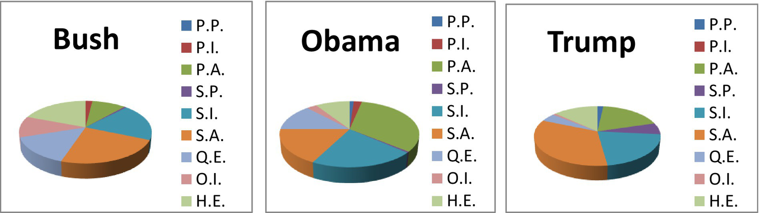 The data of this paper include three cases of English diplomatic speeches2 from three US presidents: George W. Bush, Barack Obama, and Donald Trump. Each case consists of a corpus of 10 speeches (around 32,500 words) from the same politician, with topics focusing on diplomatic relations and foreign policies. The reason why the author chooses the diplomatic speeches of the three US presidents is that these speakers have been recognized as among the most influential or controversial political speakers. Therefore, it would be interesting to investigate how these political speakers persuade or manipulate their audiences through evidentiality.