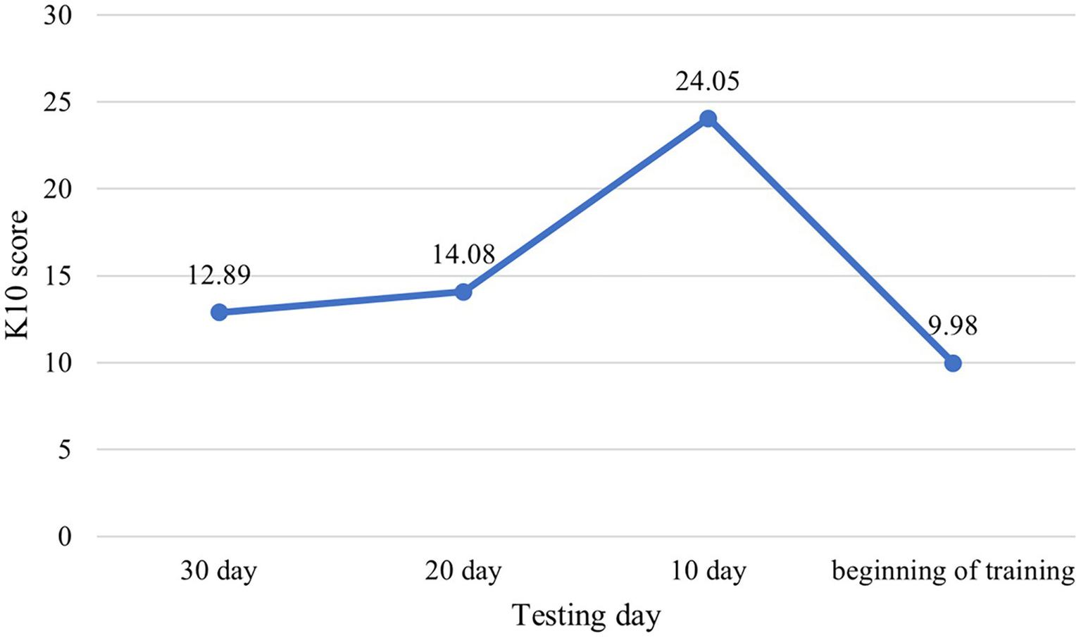 Figure 1 below gives a graphical representation of K10 scores obtained during each testing session. As can be seen, there is a sharp spike in fears at a time that tentatively coincides with the 10-day term before the study began. Since testing was not conducted daily, it was impossible to record more precise timing of this effect and provide a basis for broader generalizations. Though, the collected values do confirm the significance of the 10-day term in determining the strength of fear of starting training in the proposed version of the K10 test.