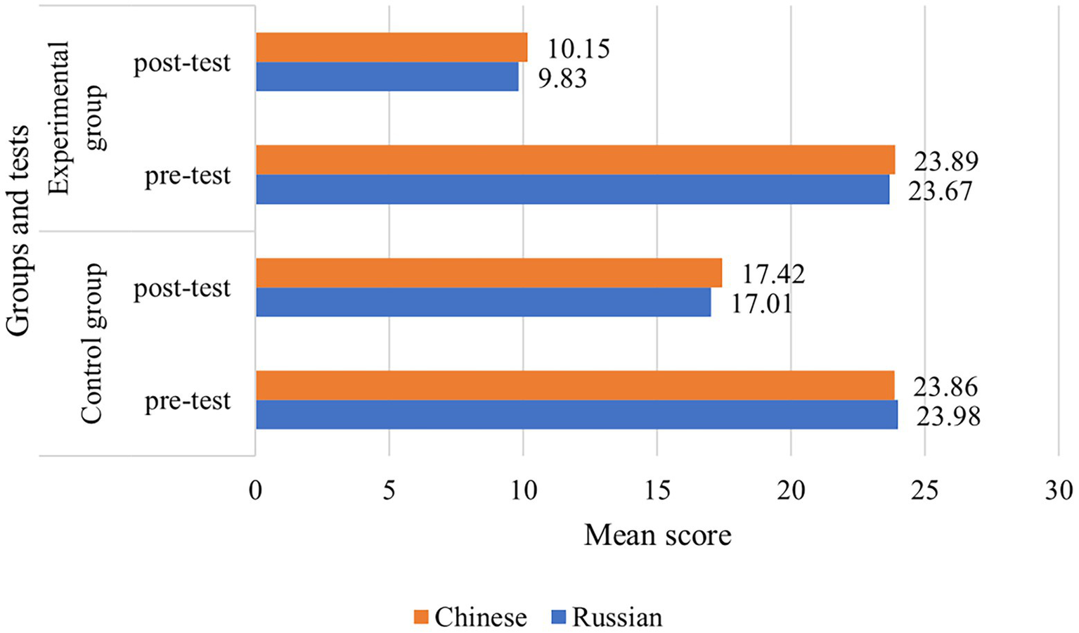 As evidenced in Figure 2, post-test scores of EG and CG improved noticeably, even though in EG, the distress level due to fear of future learning was by almost a third lower than in CG (10.15 points in the Chinese and 9.8 points in the Russian EGs vs. 17.42 and 17.01 in CGs, respectively). This observation demonstrates the already described effect of a significant reduction in fear after the start of training connected with the absence of expectation and encountering with the reality with which one can cope on his/her own.