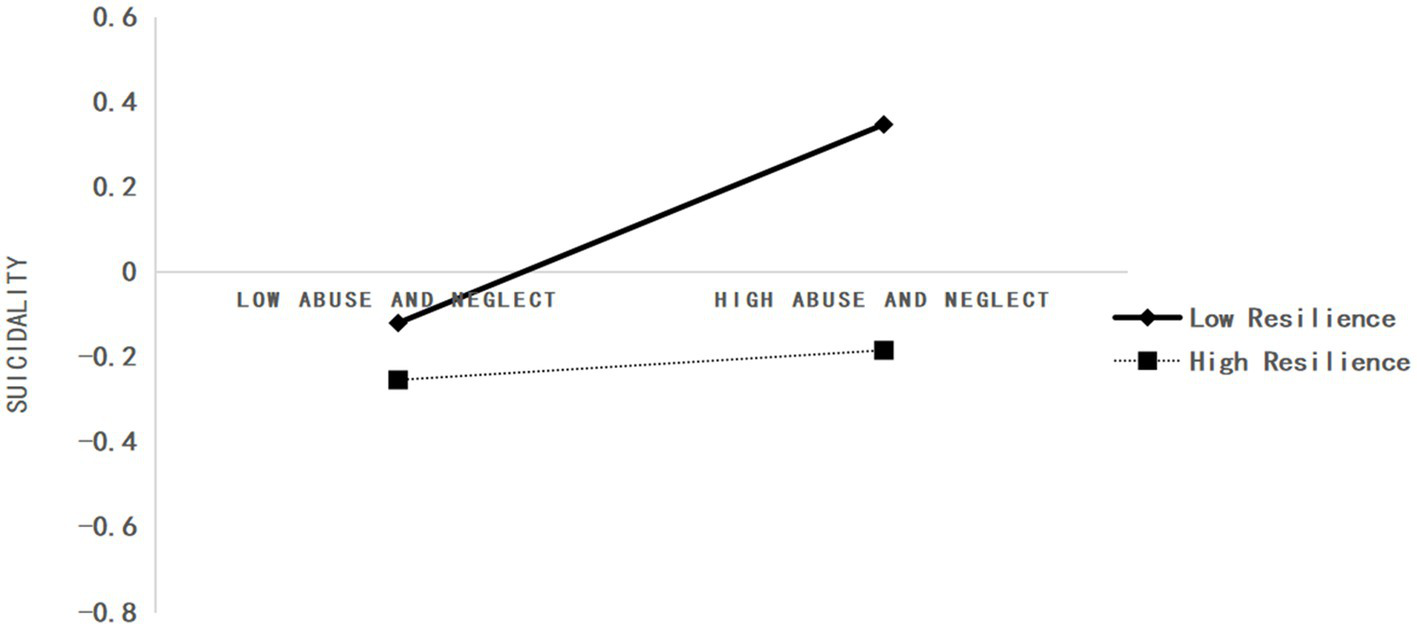 Resilience is an ability, concept, or set of beliefs that buffer an individual against the negative effects of risk factors or stressors (Wu et al., 2021). However, not all individuals who experience chronic (childhood abuse and neglect) and acute (stressful life events) stressors engage in suicidal behavior. This may be due to the presence of protective factors (resilience) that moderate the effects of chronic and acute stressors on suicide. First, according to the adjustment model of resilience, resilience can prevent the occurrence of suicidal behaviors by playing a regulatory role in the development of risk factors for suicidal outcomes (Siegmann et al., 2018). In other words, risk factors (childhood abuse and stressful life events) are associated with a higher risk of suicide; however, resilience can weaken this association, thereby reducing or eliminating the risk of suicide caused by risk factors. Furthermore, the protective model of resilience underlines that mutual restriction of protective and risk factors can help avoid harmful consequences. Protective factors can not only weaken the harm of risk factors to individuals but also reconcile the relationship between risk and adverse consequences (Garmezy, 1985). In other words, childhood abuse and stressful life events as risk factors interact with resilience to protect individuals from suicidal behavior. In the face of childhood abuse and stressful life events, a high resilience levels can promote individual adaptation, help individuals overcome adversity and setbacks, and promote growth (Angel, 2016). Therefore, we hypothesized that resilience may play a moderating role in the relationship between child abuse and neglect and suicide, stressful life events, and suicidal behaviors; that is, the direct predictive effect of childhood abuse and neglect on suicidal behavior and the mediating effect of stressful life events are both affected by resilience (H3).