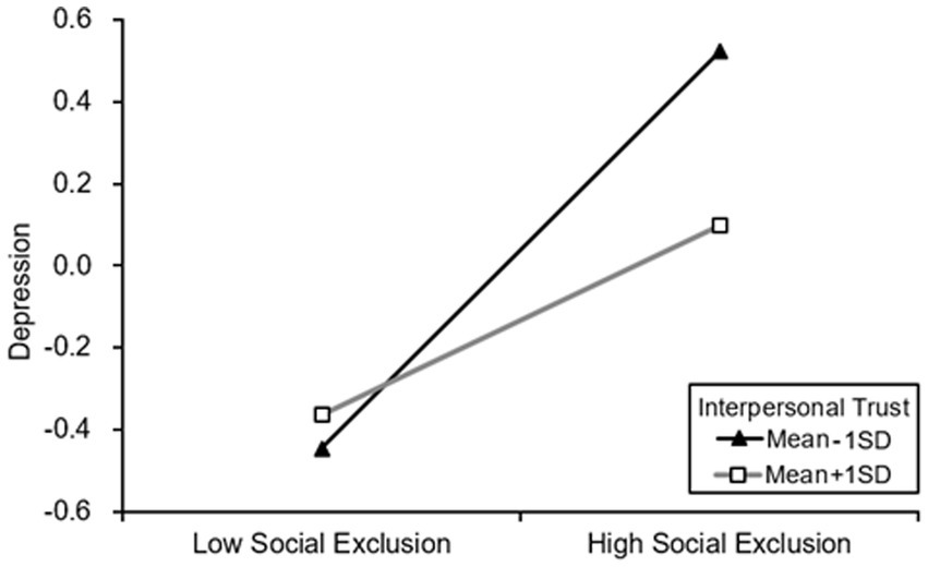 Interpersonal trust is a general expectation that individuals believe that others or other groups are trustworthy, and it is the basis for establishing interpersonal relationships (Dekker et al., 2013), and plays an important role in maintaining interpersonal relationships and promoting interpersonal communication (Betts et al., 2009). There is growing evidence that interpersonal trust is associated with mental disorders and physical health. For example, a prospective study in the United States found that individuals with high levels of interpersonal trust were less likely to suffer from mental disorders (Fujiwara and Kawachi, 2008). Conversely, there was a positive relationship between distrust and poorer self-rated health, depression, and functional limitations (Pollack and Knesebeck, 2004). Compared with younger people, older adults are more likely to experience cognitive impairment and poor physical condition, which will lead to a greater need for the emotional support and material help typically found in trusting relationships, especially in the event of negative life events (Decarli, 2003; Demura and Mitsumori., 2013). The multiple motivational models of social exclusion state that individuals who are socially excluded will engage in prosocial behaviors (such as trying to repair social relations with the excluded person) and Anti-social responses (e.g., exhibiting aggressive behavior; Richman and Leary, 2009). Individuals with higher levels of interpersonal trust are more likely to engage in prosaically behaviors (Cadenhead and Richman, 1996) and produce positive physiological and psychological responses. Other studies have also confirmed this, that is, interpersonal trust is significantly positively correlated with mental health and social support, which can buffer the negative impact of risk factors on individual mental health (Frank et al., 2014). It can be seen that after being socially excluded from others or groups, the rural elderly with a higher level of interpersonal trust may have a stronger will and more opportunities to repair the relationship with the excluded person, produce more prosaically behaviors, and then have more prosocial behaviors. Satisfy the needs of inner belonging and relieve the negative emotions such as pressure, anxiety, and depression caused by social exclusion. On the contrary, after being socially excluded, the rural elderly with a low level of interpersonal trust may neither try to repair the relationship nor seek other alternative relationships due to the lack of trust in others, resulting in a lack of sense of belonging. And produce more intense depression, thereby increasing the possibility of suicide (Yu et al., 2019).