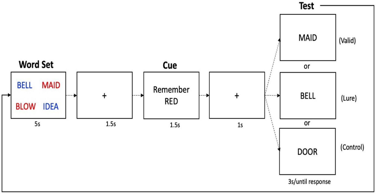An illustration of the Suppress task is shown in Figure 2. In this task, participants were first presented with four words, two printed in red, two printed in blue, in a 2 × 2 grid configuration, for 5 s. The word set was followed by a 1 s inter trial interval (ITI), and then a cue which told participants to either remember the red or the blue words. The cue remained on screen for 1.5 s. After another 1 s ITI, participants were presented with a test probe in the center of the screen. The test probe for each trial was one of three types: Valid (the test word was present in the array and was in the cued color); Lures (the test word was present in the array but was in the non-cued color); or Controls (the test word was not present in the array). Participants were told to press the “Y” key on the keyboard (for “Yes”) if the test probe was one of the words that they should still be holding in memory, or the “N” key (for “No”) if not. The test probe remained on screen for a maximum of 10 s. Of the test probes, 40% were Valid trials, which required a positive response, 30% were Lure trials in which required a negative response, and 30% were Controls, which also required a negative response. Participants completed four blocks of 25 trials. Before beginning the task, participants practiced until they achieved >60% accuracy. Feedback was not provided on experimental trials. Similar to the TBR words in the DF task which provide a baseline measure of long-term memory, the Valid trials in the Suppress task provide a baseline measure of working memory ability. Lure items, on the other hand, provide an index of inhibition: to the extent that Lure items are inhibited, they should not be familiar. Lure items that were not appropriately inhibited, on the other hand, will cause interference at the time of the probe, which will increase errors and reaction time for correct responses. The difference in performance between the Control probes and the Lure probes, called the “Suppress effect,” thus reflects inhibitory ability, where a larger difference indicates good inhibition, and a smaller (and more negative) difference indicates poorer inhibition. For accuracy, we inverted this score so that the direction of the RT and accuracy effects would be consistent. We also considered as variables the accuracy and latency scores for the Valid trials.