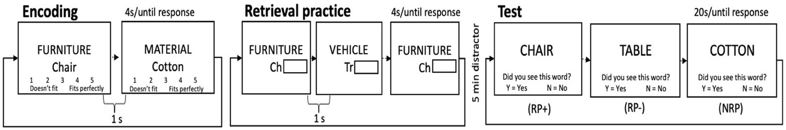 Schematic of the retrieval induced forgetting task. Shown here are two trials from the encoding phase, three trials from the retrieval practice phase, and three recognition probe trials. In this example, half of exemplars from the category ‘furniture’ were practiced, including ‘chair’ (and is hence an RP+ item), but not ‘table’, (and hence it is an RP-item). In this example, no items from the category ‘material’ received retrieval practice, and hence, all exemplars from this category (cotton, silk, burlap, etc…) are considered NRP items.