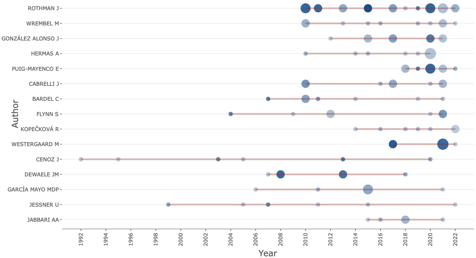 To gauge the possible difference across periods, we conducted a similar analysis for each period. Indeed, different names were identified throughout the period, demonstrating that the field of L3 acquisition was still undergoing consolidation. In the first period, Jasone Cenoz, Ulrike Jessner, and Yan-kit Ingrid Leung are the most contributing authors. In the second period, scholars like Camilla Bardel and Jean-Marc Dewaele kept working in this field. Also, more scholars were devoted to L3 acquisition, such as Jason Rothman, Suzanne Flynn, and Magdalena Wrembel. In the third period, researchers such as Jason Rothman, Magdalena Wrembel, and Jennifer Cabrelli continue to work in the field, also coming at the top area of the rank list are names of other scholars such as Abdelkader Hermas, Marit Westergaard, Jennifer Cabrelli, Romana Kopečková, and Jorge González Alonso. Consequently, the top 10 authors for the whole timespan (1984–2022) mirror that in the third period.