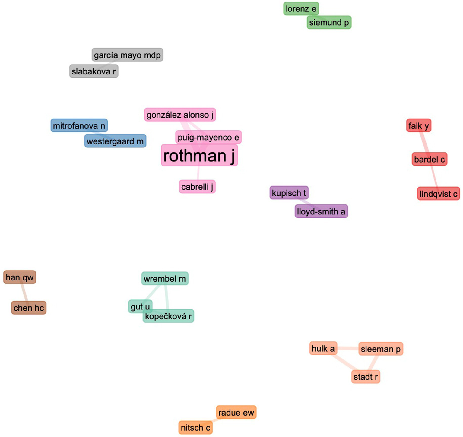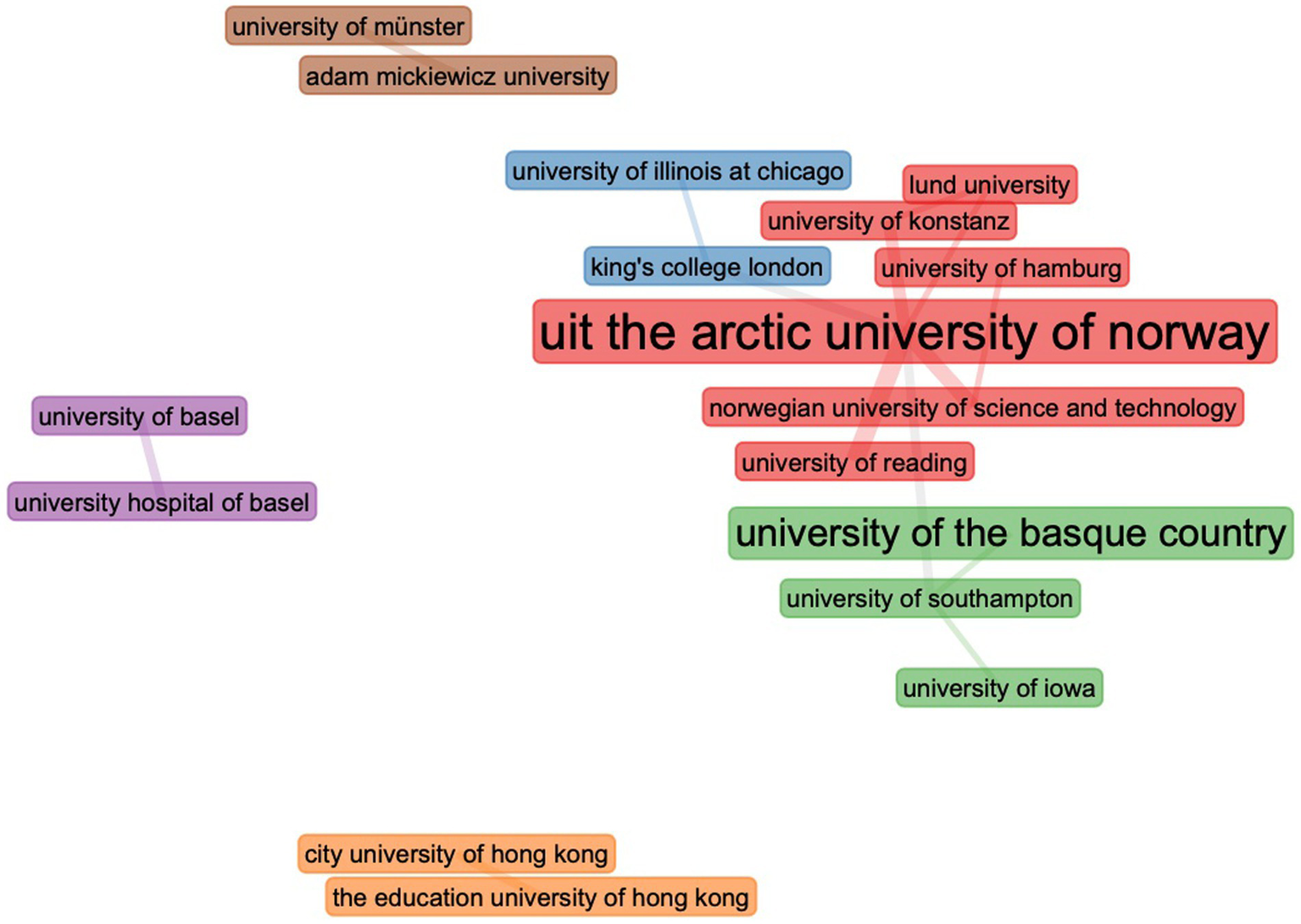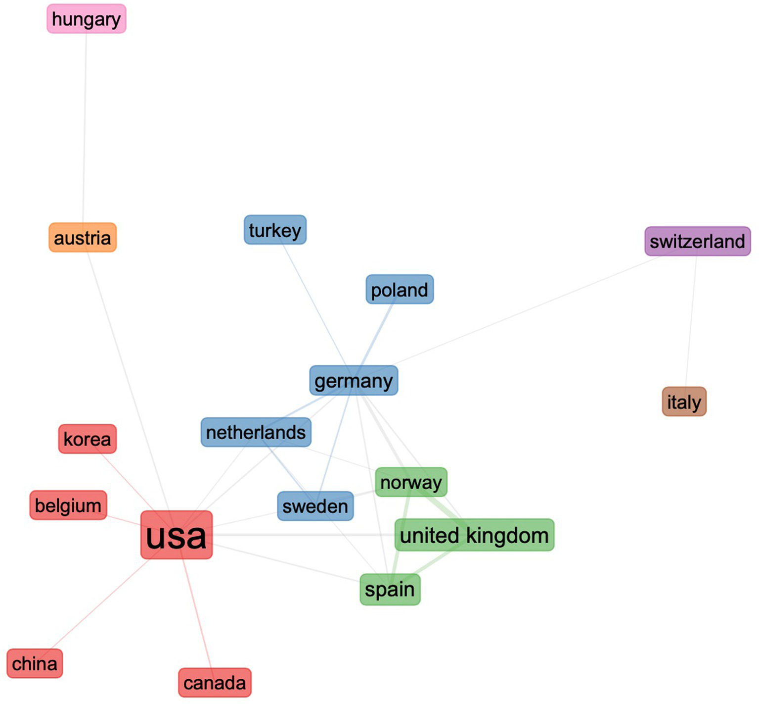 Studies of scientific collaboration (Newman, 2001; Yan and Ding, 2012) were conducted to identify the most significant relationships between the different research components, commonly used in studies to determine the social structure of a field. This is achieved through a social network analysis in which the nodes are the authors, their institution, or the country to which the institution belongs. The edges (links) are constructed based on the nodes that co-authored an article, which not only can shed light on the relative importance of research constituents but also enrich the bibliometric evaluation (Andrikopoulos and Economou, 2016; Cisneros et al., 2018; Andersen, 2021; Baker et al., 2021).