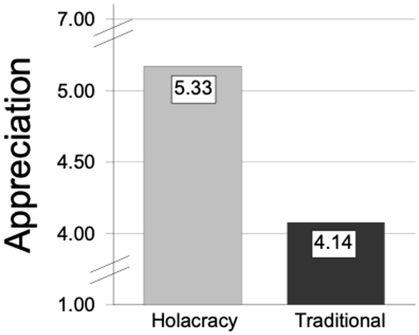 Hypothesis 2. People who work in holacratic companies will experience higher appreciation than people who work in traditional companies.