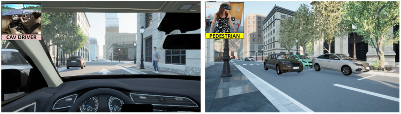 To allow participants to experience immersive interactions with automated vehicles both from the outside and on-board the AV, a dual-phase experiment was designed: one phase focused on the pedestrian’s perspective, and the other from the AV front passenger’s point of view (i.e., driver seat).