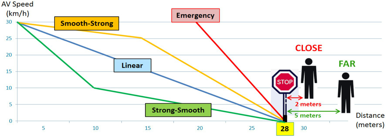 A total of eight yielding behaviors were presented to the participants for each modality studied in this experiment. These eight scenarios correspond to four decelerating behaviors (i.e., in terms of ways to brake and AV dynamics) associated with two stopping distances, as illustrated in Figure 3.