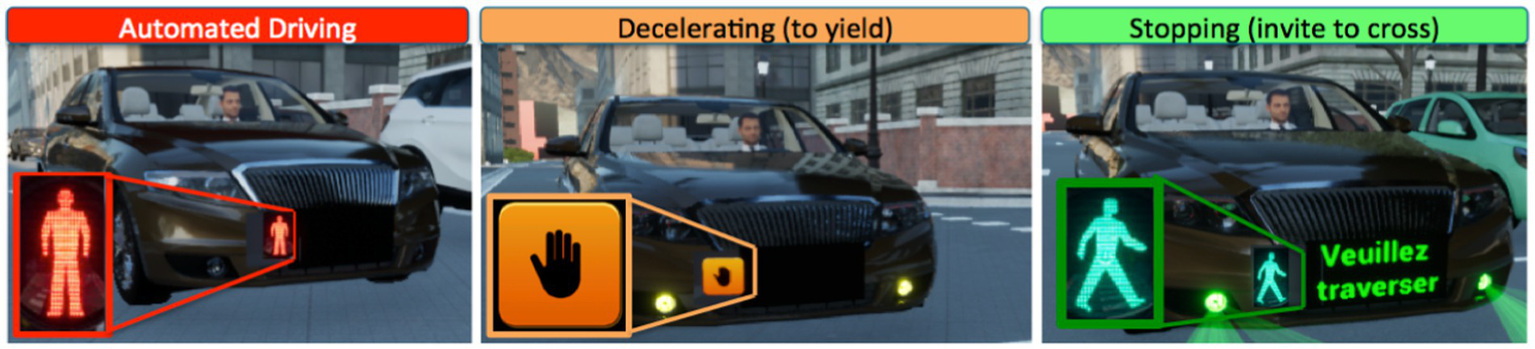 The eHMI designed for this study is made of two components: a pictogram, presented on the vehicle grille to explicitly indicate the AV status, and a set of lights able to dynamically draw crosswalks on the street to communicate with pedestrian about the crossing opportunity. Figure 4 presents the 3 pictograms of the eHMI according to the AV status. During automated driving (1st image), a red pedestrian (similar to the symbol used on traffic lights) is presented, informing other road users not to cross. Then, when the AV decides to yield and starts to decelerate, a new pictogram is presented (i.e., 2nd image: a black hand in an amber square) to inform the pedestrian about the AV yielding intention, however requiring the former to wait for some additional seconds the full stop of the car before crossing. Finally, when the AV is stopped, a green pedestrian pictogram is displayed in combination with the short text “Veuillez Traverser” (i.e., “Please Cross”; cf. 3rd image).