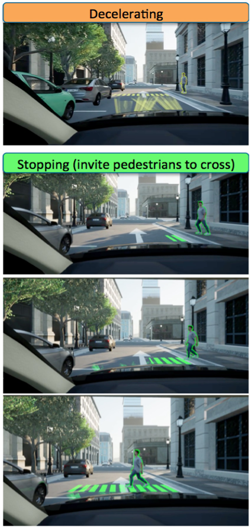 Lastly, Figure 6 presents the eHMI as perceived from the front AV passenger point of view (i.e., from the driver’s seat). In association with the external drawing of the crosswalks, an additional information is delivered through the head-up display to inform the passenger about the AV’s perception, decision, and intention, taking the form of the outline of the detected pedestrian required to be yielded (in Amber, during the decelerating phase, and then in Green, when the AV stops).