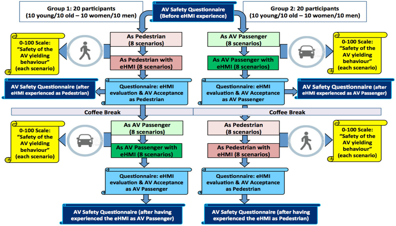 Figure 7 provides an overview of the test procedure implemented for this study. Before the experiment, all the participants completed the AV Safety questionnaire (a priori judgments).