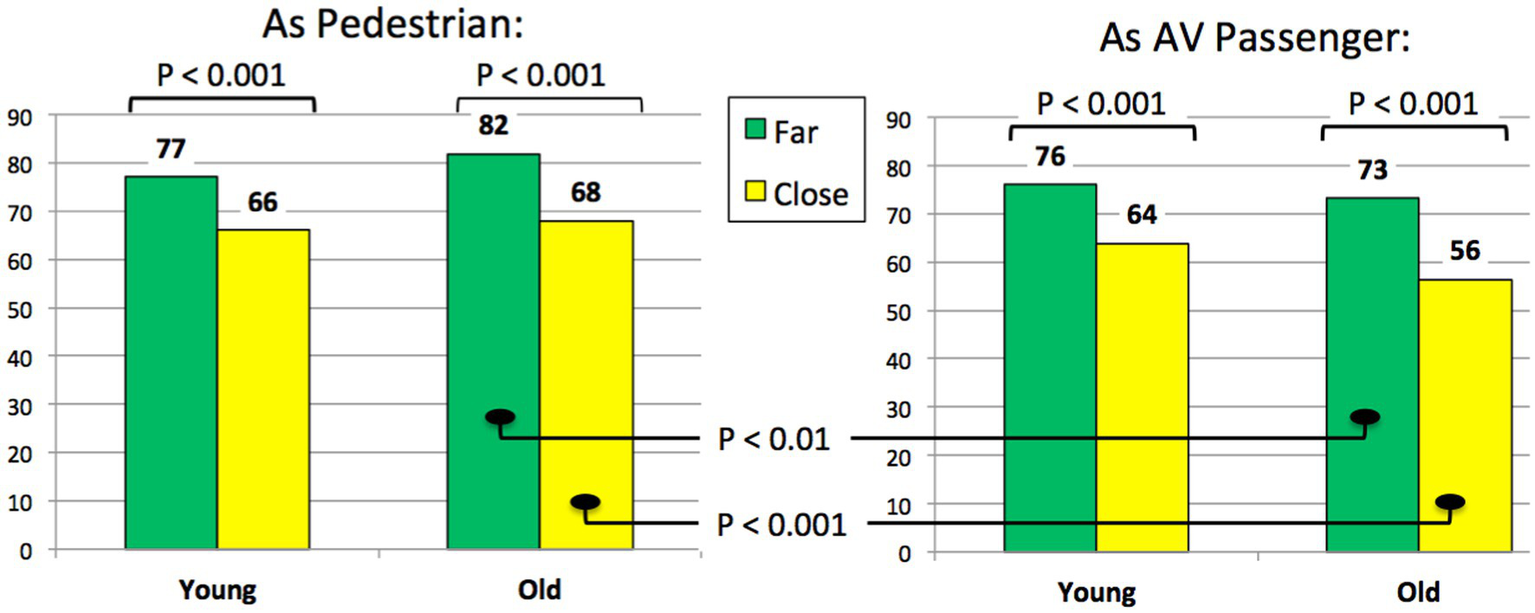 More interestingly, a significant difference is also found for the sample of older participants: their safety ratings about AV behaviors are significantly higher (paired t-tests), for both Far and Close distances, when assessed from the pedestrian than from the AV passenger point of view. This result indicates that elderly people have not the same way to perceive and assess the safety of AV yielding behaviors from “the inside” and from “the outside” of the car: as a pedestrian, they assess them significantly safer than as a passenger. Conversely, it is not the case for the young participants, who rate AV behaviors similarly, whether as pedestrians or as AV passengers.