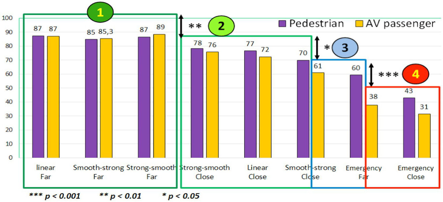 As a first general result, not any significant order effect was found between the data collected for groups 1 and 2 (t-tests), meaning that experiencing the scenarios as a pedestrian “before” or “after” having experienced them as an AV passenger has not any significant impact on participants’ evaluations.