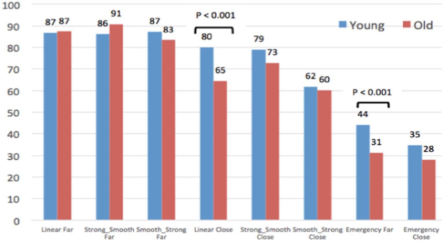 As shown in Figure 9, combining old and young participants’ ratings, significant differences (paired t-tests) appear between four main blocks of AV braking behaviors in terms of safety assessment, both as pedestrians and as AV passengers. As initially assumed, the Far stopping distance associated with Linear, Strong-Smooth, and Smooth-Strong deceleration is assessed as highly safe by all the participants (more than 80/100, corresponding to a high positive value; cf.Distler et al., 2018). At the other extremity of the string, Close Emergency braking of the AV is assessed as an unsafe behavior to yield, especially from the AV passenger’s point of view (31/100).