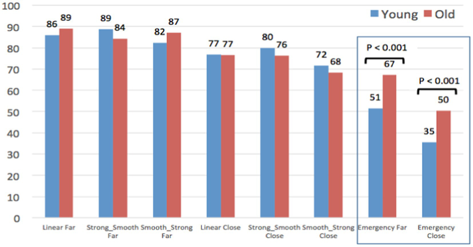 Finally, when jointly considering results of Figures 10 and 11, differences between old and young participants are highly contrasted: Although young participants provide quite similar judgments from the Pedestrian and the AV Passenger’s point of views, older participants’ ratings are totally different regarding the 2 Emergency braking (difference of 36 points for Emergency Far, and of 22 points for Emergency Close). As pedestrians, it seems that elderly participants have difficulties to visually perceive and evaluate the abruptness of the AEB deceleration, which is not the case when they experience the same AEB yielding behaviors on-board the AV.