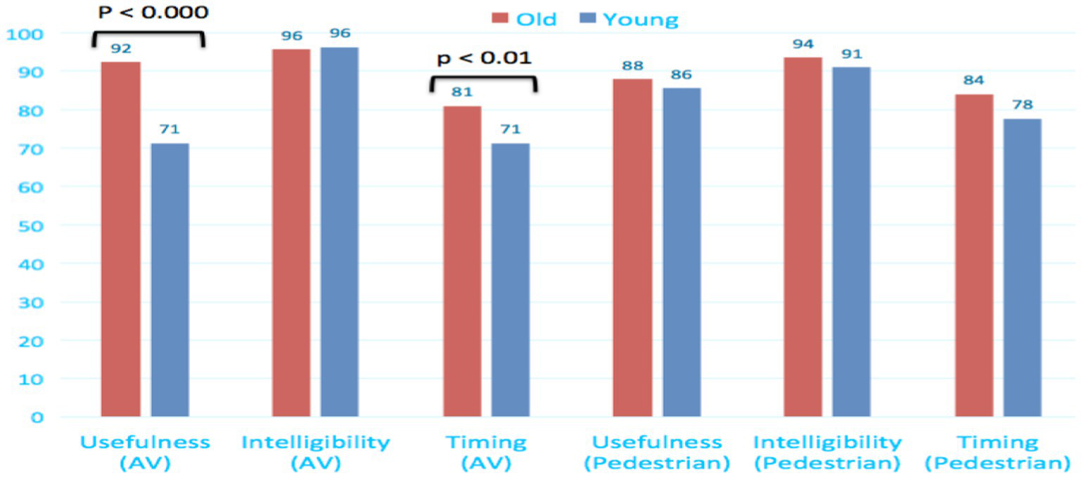 This benefit is particularly important for elderly people as pedestrians. Indeed, their acceptance to interact with AVs without eHMI is relatively low compared to young participants (56 against 72) but, conversely, very high (and equivalent to young participants’ judgments) when the AV is equipped with the eHMI (93/100).