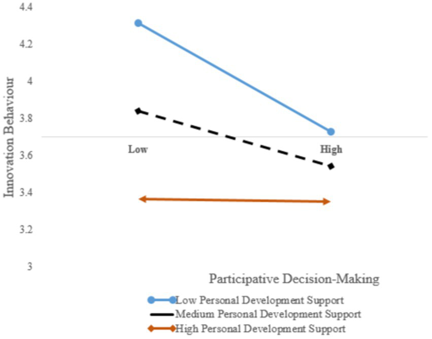 Finally, personal development support has a significant moderating effect on the relationship between participative decision making and innovative behavior.