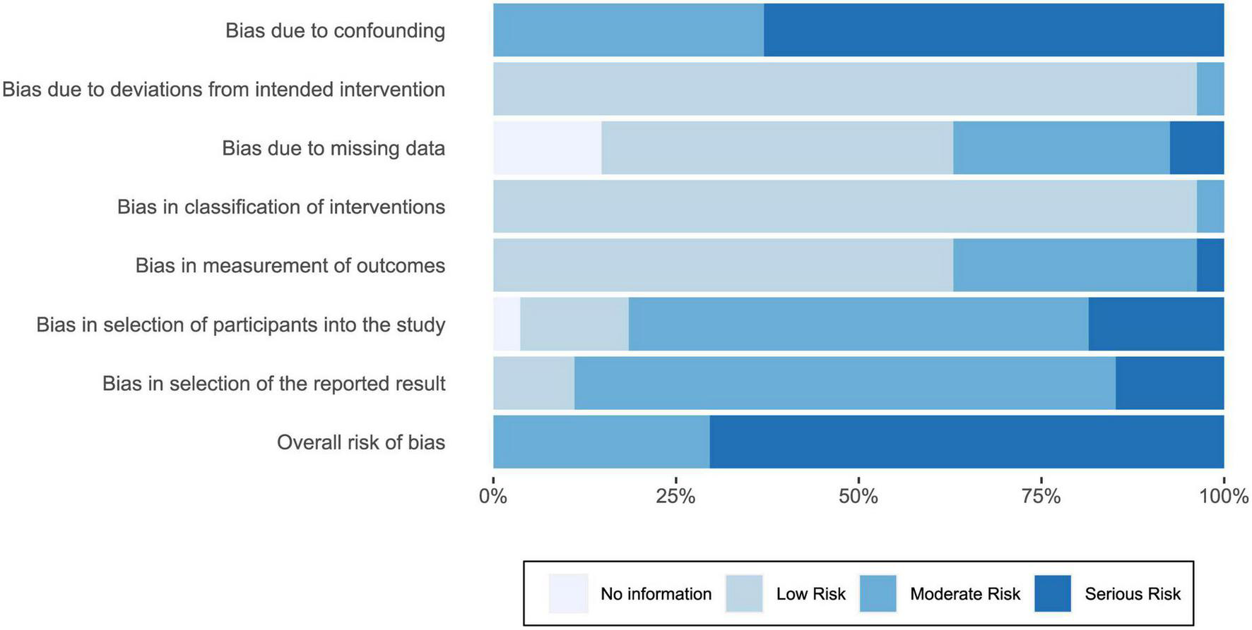 Figure 3. Summary of risk of bias judgments, illustrating the proportion of studies that were judged to be at low, moderate, or serious risk of bias (or whether sufficient information was not available for a judgment) for individual domains of bias and overall risk.