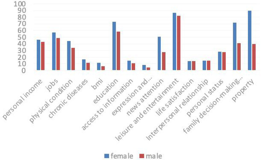 As shown in Figure 2, the comparison of the poverty incidence rates of women and men in various indicators indicates that the poverty incidence of women in six dimensions and 15 indicators is higher than that of men, including work status, self-assessed health, education level, and news attention. The gender difference in poverty incidence of household decision-making power and property rights indicators is particularly significant. This shows that women are poorer than men in economy, health, humanities, and rights.
