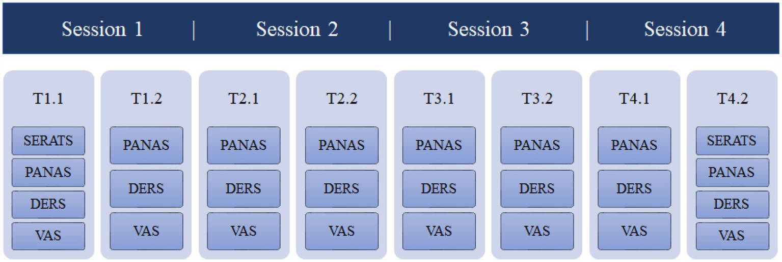 Patients completed the Self-expression and Emotion Regulation in Art Therapy Scale (SERATS) before session 1 and at the end of session 4, as it is indicated to be used after more than one art therapy session (Haeyen and Noorthoorn, 2021). Furthermore, questionnaires were completed before and after every individual session: Positive and Negative Affect Schedule (PANAS), two scales of the Difficulties in Emotion Regulation Scale (DERS) and two visual analogue scales (VAS; see Figure 1).