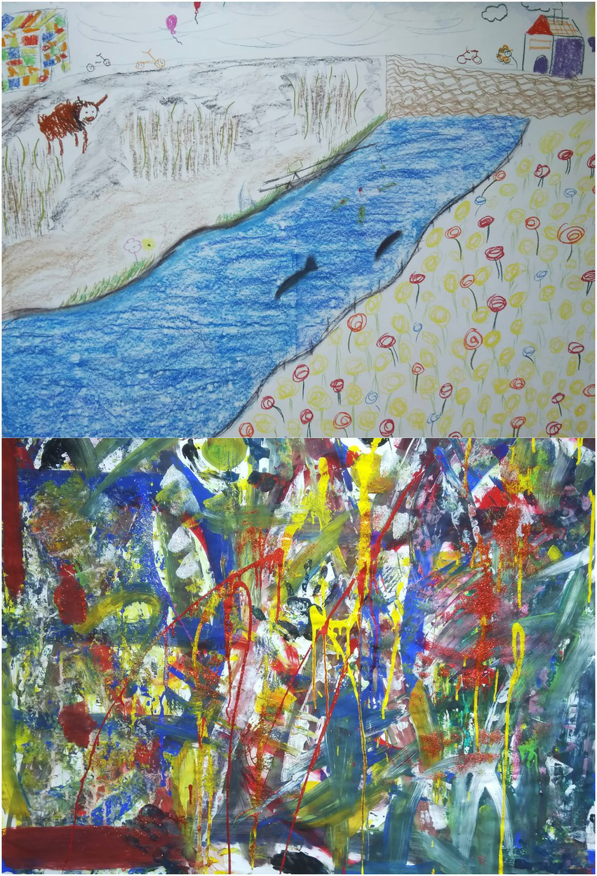 Interviews were conducted after session 4. These were semi-structured interviews. A topic list derived from the research questions (Taylor et al., 2015; Hennink et al., 2020) was used as a guide, and participants were encouraged to share their subjective stories using their own words to explain their personal experiences. Interviews lasted approximately 45 min and were carried out no longer than 4 weeks after completion of the intervention sessions. There was no selection for participation in the interviews, patients who offered to participate were included to a maximum of eight patients and two involved therapists. Interviews were recorded and transcribed. The artworks were present in the interview situation. Patients’ artworks were photographed after the interview. Interviews with the expert art therapists who carried out the intervention emphasized the patients’ perceived mechanisms of action in the offered work forms relating opposites.