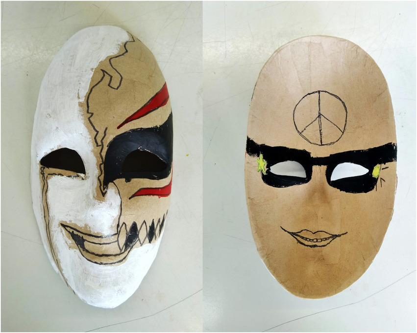 Session 2:“Mask inside out.” This session starts with a guided imagery to draw the attention to one’s inner world. After this, patients are instructed to paint a mask as a symbolic self-portrait of one’s inside (inner feelings) and outside (outside portrayal), depicting the inside out, and the outside in. Reflection afterward is focused on the message that it is okay to show your inner feelings.