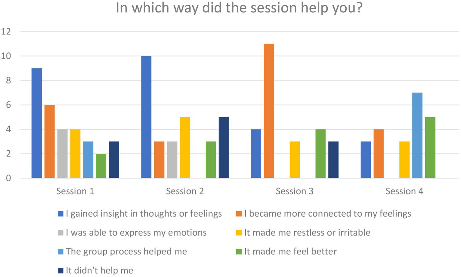 The VAS form also included an open question: “In which way did the session help you?.” Participants were asked this to gain insight into their motivation of their scores. Furthermore, this question gives information regarding the patients’ perception of the added value of working with opposites as a mechanism of change.