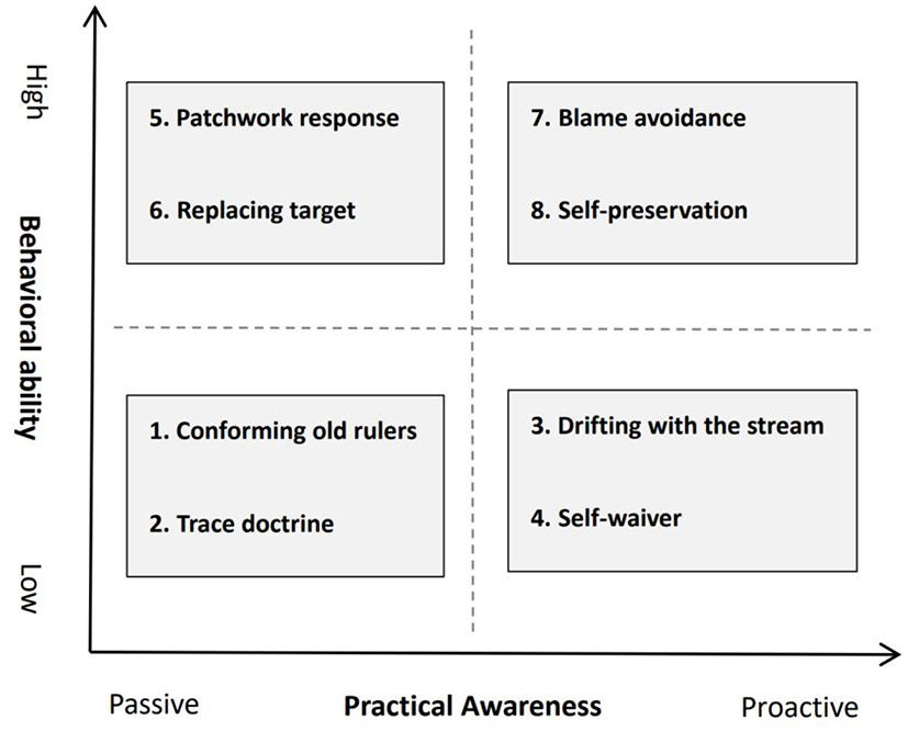 “Practice consciousness” is the basis of Giddens' structural functionalism, which dissolves the dichotomy between action and structure and provides enlightening insights for understanding the “invalid busyness” behavior of grassroots cadres (Giddens, 1986: 6). On the one hand, low behavioral capacity-passive practice awareness: conforming old ruler/trace doctrine. The “invalid busyness” behavior is the passive response of grass-roots cadres in the face of multiple task requirements, which is mainly reflected in their own incompetence and improper pressure transmission and passive abandonment of professional autonomy, which inevitably results in the loss of individual autonomy of cadres and mechanical repetition of coping with work, leading to the alienation of trace management into traceism. On the other hand, high behavioral capacity-proactive practice awareness: self-preservation/blame avoidance. Facing the increasingly heavy pressure of regulation and accountability, the political consciousness of some grassroots cadres gradually alienates into self-preservation of responsibility avoidance, which is mainly reflected in the fact that some grassroots cadres are busy coping with the assessment and supervision of higher levels, and even jointly coping with the assessment and supervision of higher administrative bodies to avoid accountability and responsibility.