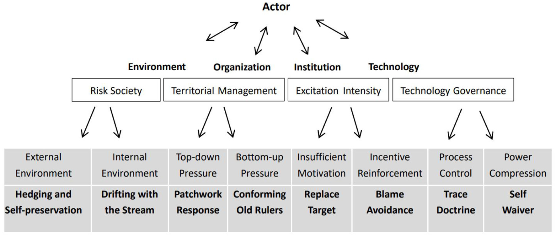 A top-down power structure of governments is adopted in China, including governments at “central, provincial, municipal, county and township” levels, which corresponds to the bottom-up responsibility system. The principle of territorial management aims to effectively bridge the governance gap and enable governments at all levels and functional departments to assume the governance responsibilities within the territory. However, in the actual political scene, the enhancement of territorial responsibilities at all levels is alienated into a tool to shirk responsibilities at all levels, which makes the grassroots fall into the dilemma of “small power but big responsibility, many affairs but scarce resources and insufficient capacity,” unable to conduct effective management.