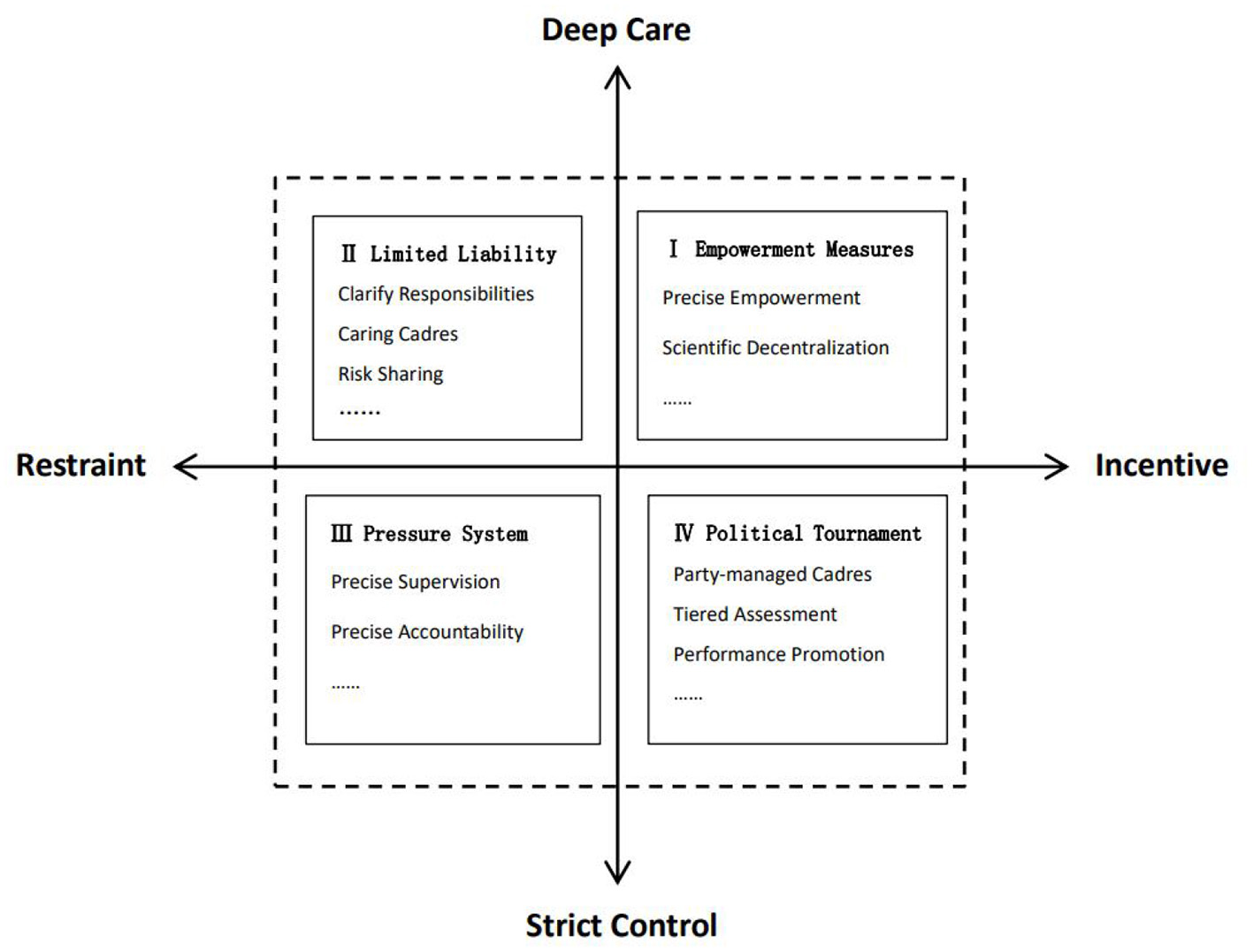 The grassroots are the “last kilometer” of national governance and the “first kilometer” of social governance. The level and efficiency of grassroots governance have a bearing on the overall development of the Party and the state. In the face of the current “invalid busyness” behaviors of some grassroots cadres, it is urgent to respond and correct them from theoretical and practical perspectives in a bid to better transform the institutional advantages into governance efficiency. According to the externalization and formation mechanism of the “invalid busyness” behaviors of grassroots cadres, they can be corrected from four dimensions including “incentive, restraint, deep love and strict control” (as shown in Figure 3).