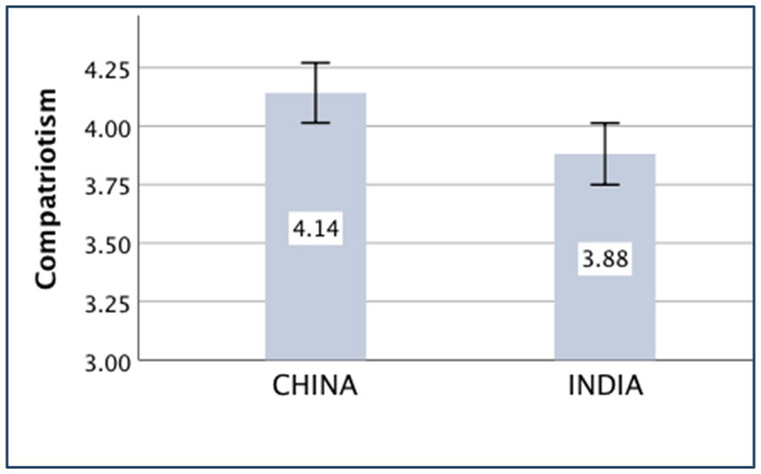 The main effect of the country on compatriotism was significant [F(1,430) = 6.46, p = 0.011, partial η2 = 0.015]. The Chinese (M China = 4.14, SD China = 0.93) participants showed higher compatriotism than the Indian participants (M India = 3.88, SD India = 1.00).