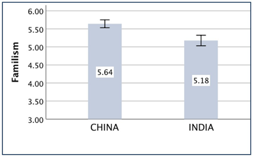The main effect of the country on familism was significant [F(1,430) = 23.07, p < 0.001, partial η2 = 0.051]. The Chinese participants (M China = 5.64, SD China = 0.80) were more familistic than the Indian participants (M India = 5.18, SD India = 1.10).