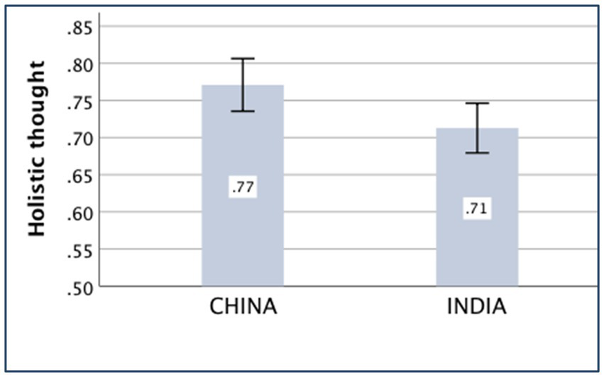 The main effect of the country on holistic thought was significant [F(1,430) = 9.64, p = 0.002, partial η2 = 0.022]. The Chinese participants (M China = 0.77, SD China = 0.26) were more holistic than the Indian participants (M India = 0.71, SD India = 0.25), and the interaction between country and socioeconomic status was significant [F(1,430) = 8.14, p = 0.005, partial η2 = 0.019). The independent-sample t-test showed that the difference in holistic thought between the Chinese (M China = 0.78, SD China = 0.26) and Indian (M India = 0.77, SD India = 0.24) participants was not significant for those with high socioeconomic status [t(301) = 0.38, p = 0.701]. For participants with low socioeconomic status, the Chinese sample (M China = 0.76, SD China = 0.25) scored significantly larger than the Indian sample (M India = 0.61, SD India = 0.25) in holistic thought [t(133) = 3.48, p = 0.001, d = 0.60].