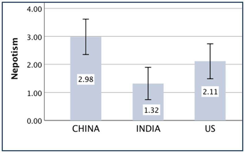 The main effect of the country on nepotism was significant [F(1,430) = 35.53, p < 0.001, partial η2 = 0.076]. The Chinese participants [MChina = 3.03, SD China = 4.52] were more nepotistic than the Indian participants [M India = 0.68, SD India = 4.13].
