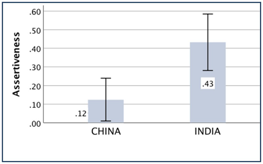 As in study 1, three separate sets of one-way analysis of variance (3 × 2 × 2) with the country (China, India, and the United States), gender (male and female), and socioeconomic status (high and low) as variance factors were conducted to examine the differences in nepotism, IOS, and relative experience of engaging vs. disengaging emotions among the Chinese, Indian, and American participants. The assertiveness and argumentativeness of Chinese vs. Indian participants were compared using another two sets of one-way analysis of variance (2 × 2 × 2) with the country (China and India), gender (male and female), and socioeconomic status (high and low) as variance factors. A mediation analysis was also implemented to examine whether assertiveness is a mediator between a country and another independent variance.