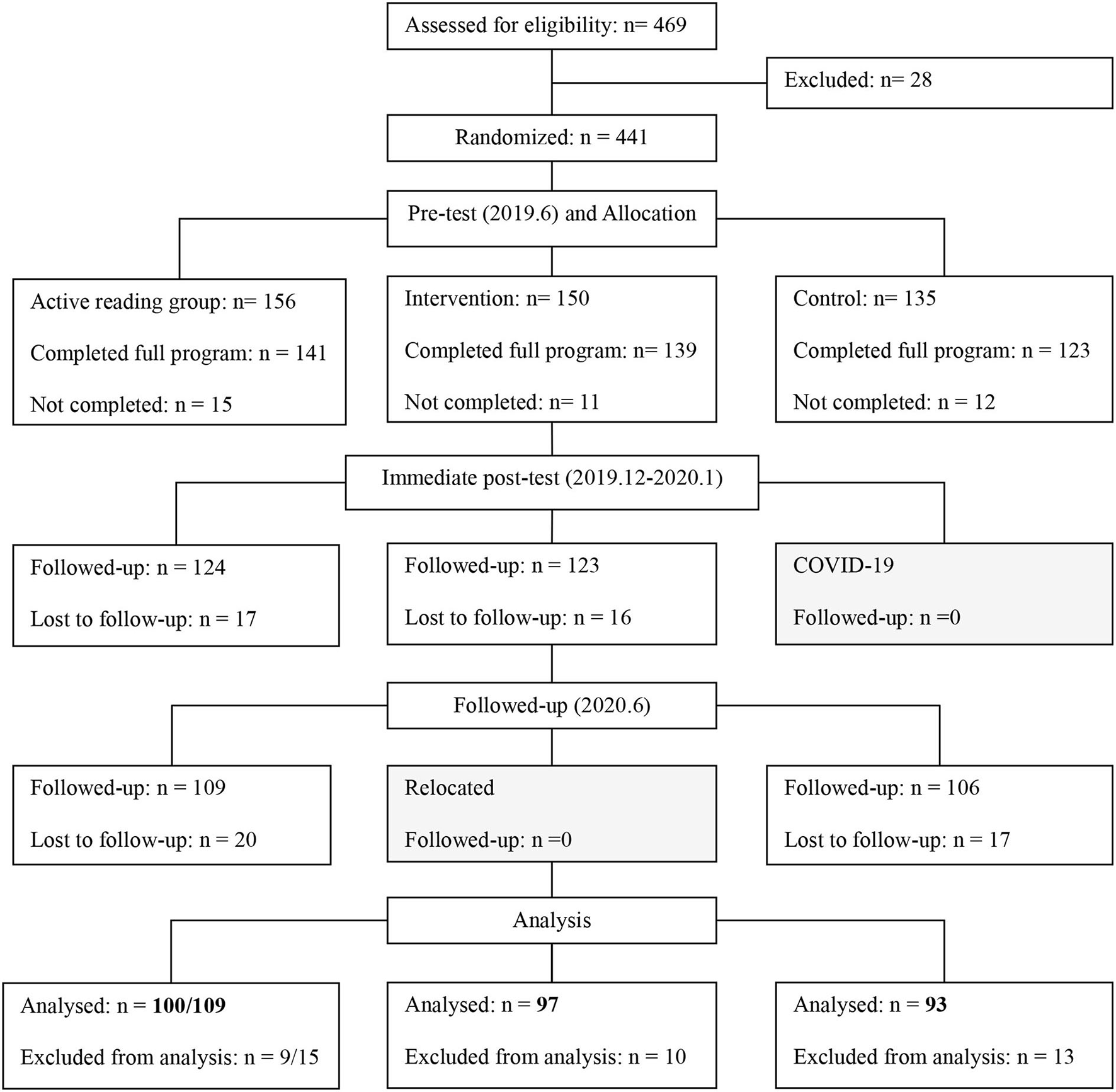 The consolidated standards of reporting trials of this study. For active reading group, n (T1) = 156, n (T2) = 124, n (T3) = 109; For intervention group, n (T1) =150, n (T2) =123; For control group, n (T1) = 135, n (T3) =106; In our final analyses, we compared active reading group (n = 109) and intervention group (n = 97), active reading group (n = 100) and control group (n = 93).