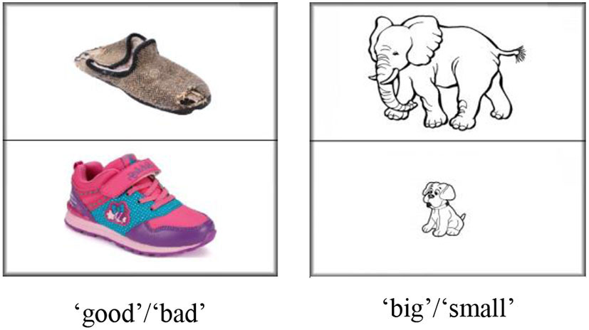We modified the classical Stroop paradigm (MacLeod, 1991) according to the actual situation (children were younger than reading age). In this picture–voice interference test, items were scored as correct if the child pointed to pictures that were easily recognizable and easy to understand (e.g., “good,” “big,” refer to Figure 3). The pictures and instructions were recorded and coded in the DelPhi to ensure each child received the same stimulation. The following are the main instructions: