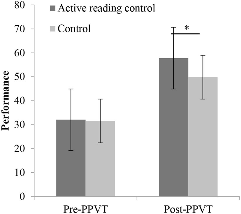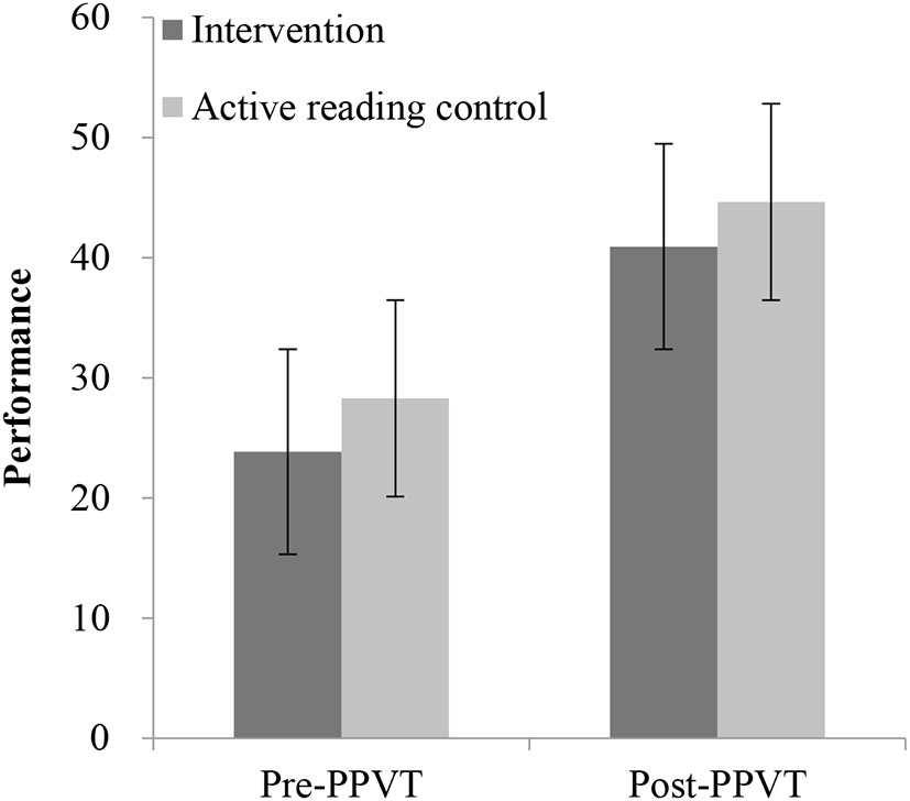 To test the effects of the intervention/language environment, we conducted several repeated-measures ANOVAs for each of the assessment tasks, with a group (intervention group and active reading control group; active reading control group and control group) as the between-subjects factor and session (pretest, posttest) as the within-subjects factor (refer to Tables 3, 4).