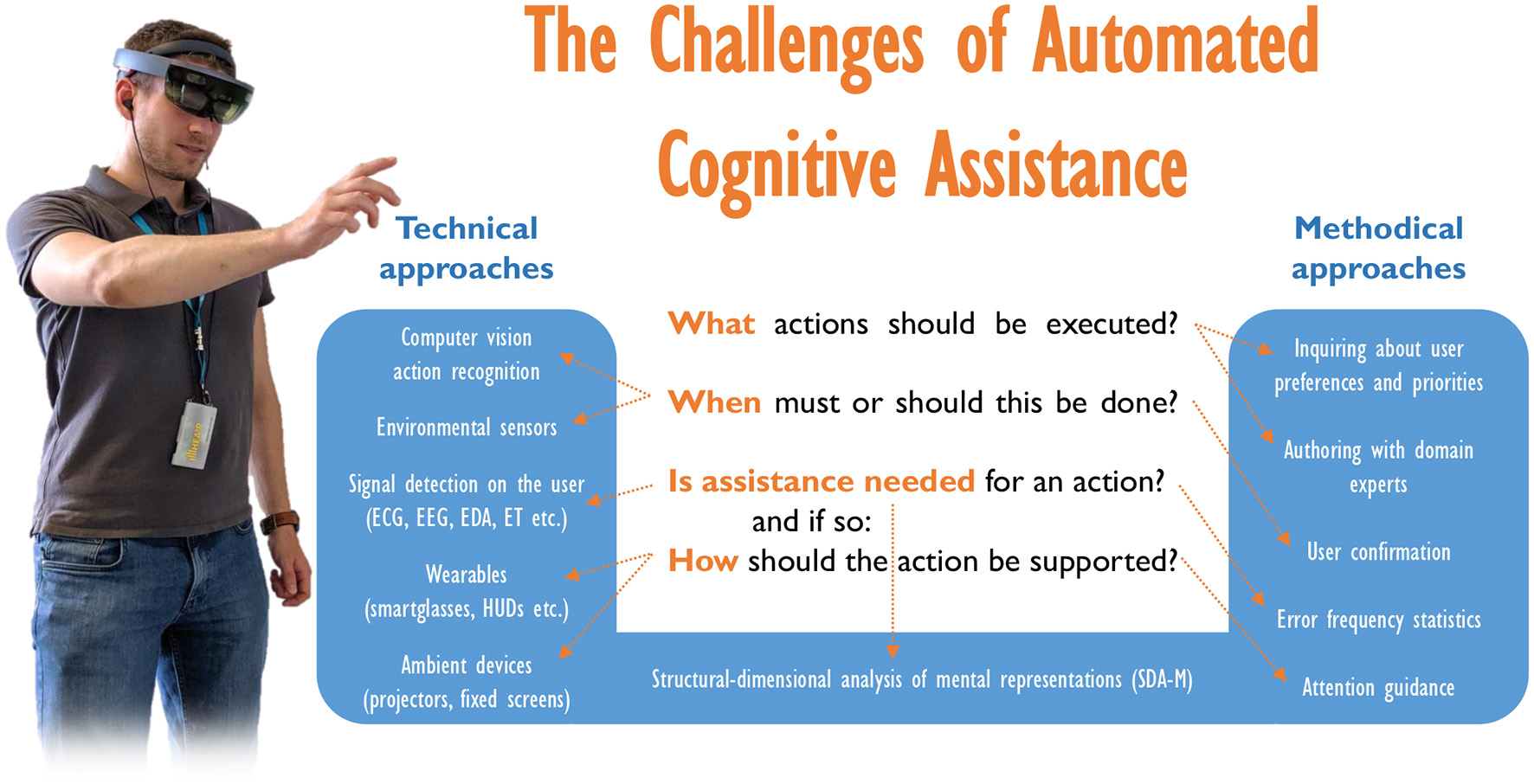 The treatment of question 2 (“When must or should this be done?”) could again be divided into a) the determination of an optimal sequence of different actions when performing several activities in parallel and b) the recognition of the current state. The search for an optimal temporal ordering of actions is addressed by theoretical and practical computer science in the context of scheduling algorithms under various conditions, but unfortunately many variants of this problem have turned out to be NP-complete, i.e., practically intractable (Ullman, 1975). Thus, in many cases, a technical assistance system can only find and propose approximately optimal solutions. Nevertheless, considering the properties and limitations of human working memory and cognitive bottlenecks in attention and executive functions (Anderson et al., 2004; Borst et al., 2010; Salvucci and Taatgen, 2010), any help in multitasking is likely to be welcome. Recognition of the current activity state is obviously necessary for a cognitive assistance system to know when to be proactive. In this respect, impressive progress has been observed for years in the fields of computer vision and action recognition facilitated by machine learning techniques (e.g., Baccouche et al., 2011; Schröder and Ritter, 2017; Abdulazeem et al., 2021), but overall these have so far typically still been limited to specific, well-defined applications and require prior recording of, or access to, huge amounts of data. For the foreseeable future, therefore, technical systems are likely to fall short of the power of human cognition in this area. A less elegant but technically simpler and much more robust approach is to ask for users' conformation that they executed an action or otherwise initiated or recognized a relevant change of the activity state. Other possibilities lie in the use of environmental sensors and other external data sources that can provide information on the current activity status. For example, if a user shall be assisted while operating a complex industrial machine, that machine may already be connected to suitable external or built-in sensors for gathering process status information and make them available to the assistance system.