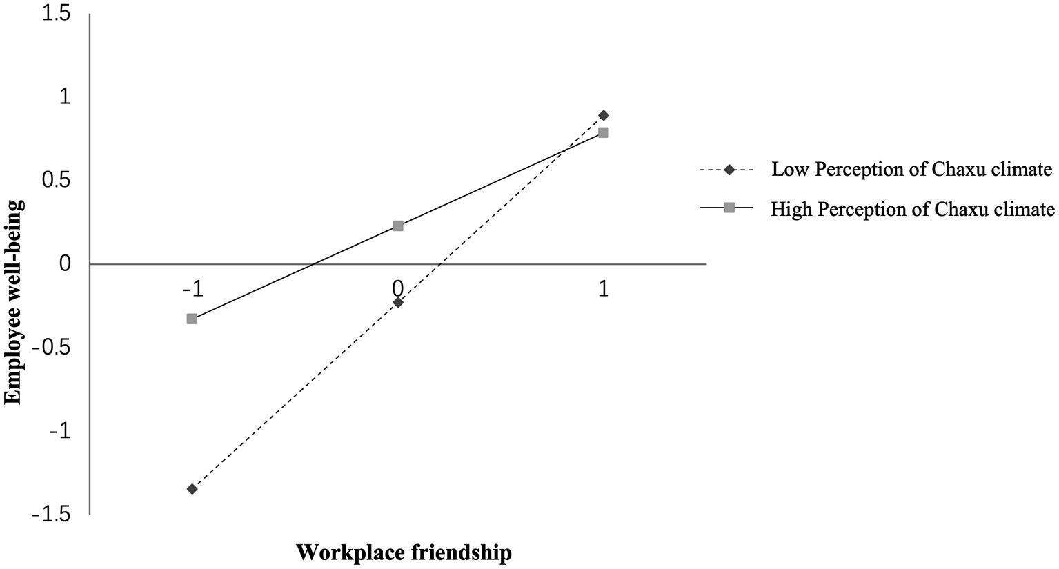 Moderating effect test. In order to reduce the influence of multicollinearity on the results, we standardized the variables before calculating the interaction terms. From Table 5, the interaction term between perception of Chaxu climate and workplace friendship negatively affects employee well-being (β = −0.192, p < 0.001) with a 95% CI of [−0.244, −0.141] and 95% confidence interval excluding 0. This indicates that the stronger the perception of Chaxu climate, the weaker the positive relationship between workplace friendship and employee well-being, which supports H3. And the effect of workplace friendship on employee well-being at different levels of perception of Chaxu climate is shown in Figure 2.
