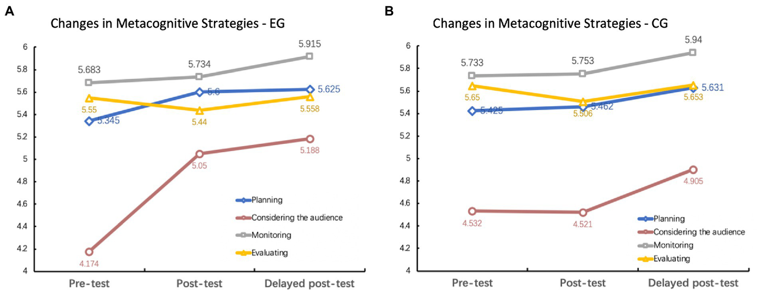 Descriptive statistics of learners’ reported metacognitive strategy use between two conditions in the pre-, post-and delayed post-tests are shown in Table 2 and Figure 2.