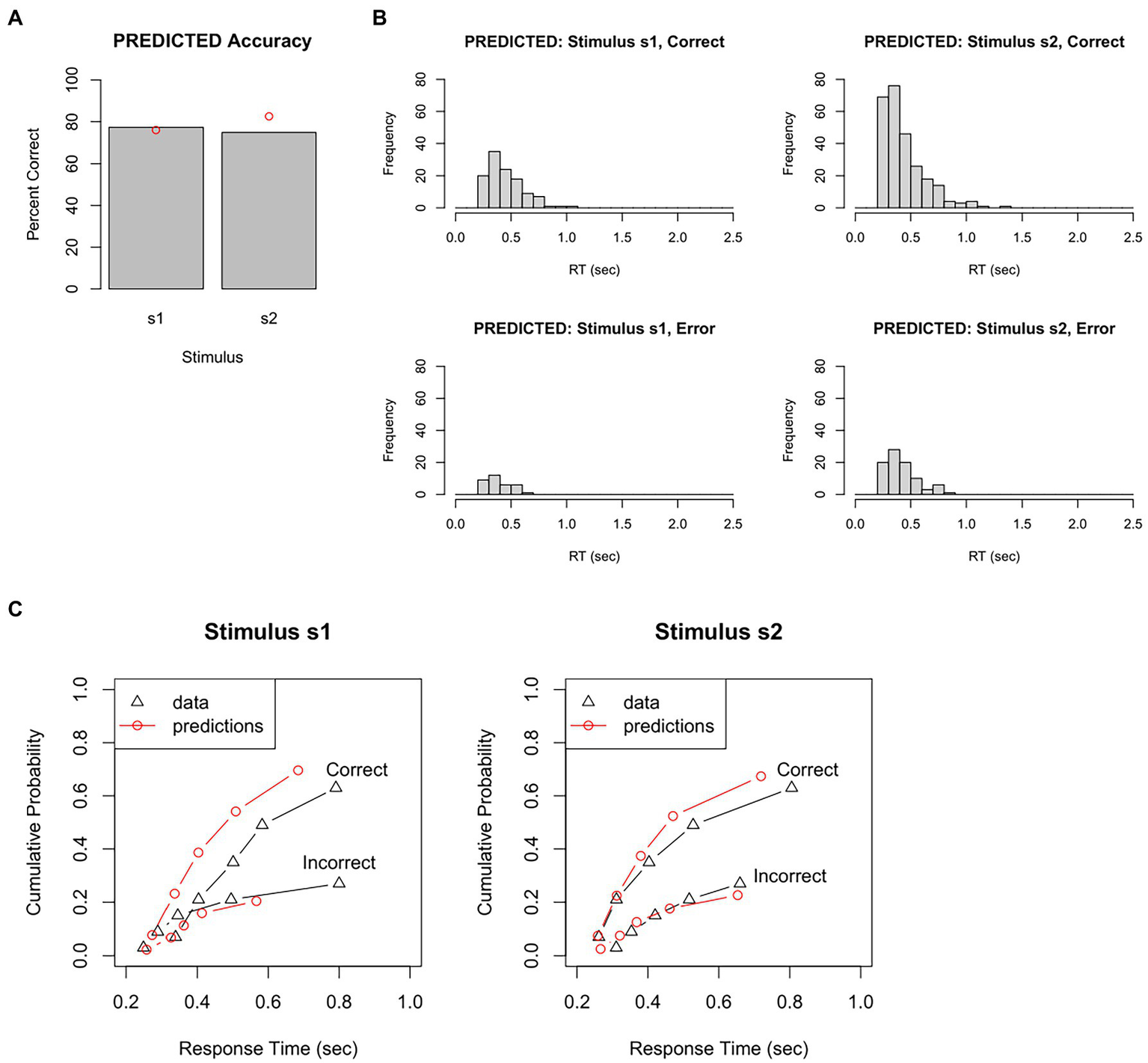 We could also plot PDFs and CDFs of the predicted data, to see how closely these overlap the PDFs and CDFs from the empirical data. For example, the empirical data could be divided into quantile “bins,” for example, based on the RT at which the fastest 10%, 30%, 50%, 70%, 90%, and 100% of RTs have occurred. For our test dataset, this would result in an approximation to a degraded CDF shown by the black lines in Figure 5C. The simulated data generated by the DDM can be plotted in the same way (red lines in Figure 5C). In this example, the correspondence between empirical and predicted data is not great. For example, according to Figure 5C-left, 90% of incorrect responses to stimulus s1 have occurred by about 800 msec; the model, however, predicts that 90% of error responses to s1 will have occurred by about 600 msec. In other words, the particular set of DDM parameter values used to generate these predicted data do not reproduce the empirical RT data very accurately.