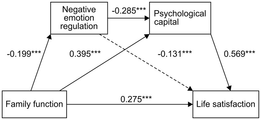 Further, the mediating effect of the negative emotion regulation strategies between family function and life satisfaction was examined using the family functioning-negative emotion regulation strategies-life satisfaction model (Table 5). The results showed that c = 0.501 (t = 17.517, p < 0.001), a = −0.199 (t = −6.132, p < 0.001), and b = −0.131 (t = −4.534, p < 0.001), indicating that the indirect effect of negative emotion regulation strategies on life satisfaction was significant. Additionally, c’ = 0.475 (t = 16.449, p < 0.001), indicating that the direct effect of family functioning on life satisfaction was significant.
