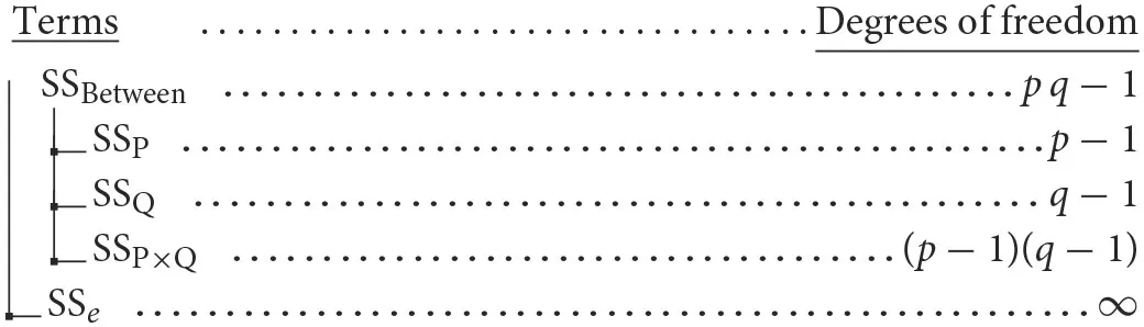 in which are the q marginal means across factor P, are the p marginal means across factor Q, is the grand mean, and var(Āi•) is the variance across the p means, whereas var(Ā•j) is the variance across the q means. From these and the degrees of freedom, we obtained the mean squares in the usual fashion:
