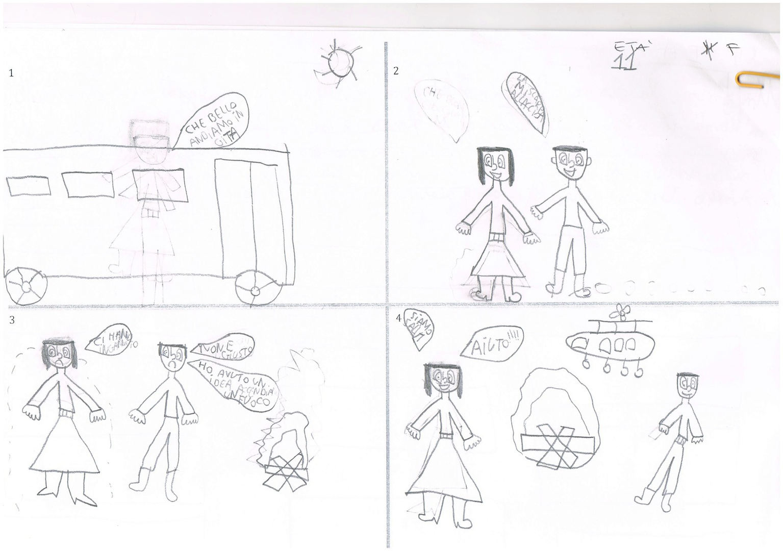 Drawn Stories Technique. Positive compensated outcome (PCO) example: “During a school trip, two scholars stop to look at the landscape but are abandoned by the rest of the class. Finally, they light a fire and have been saved with an helicopter.” Male, 11 years old.